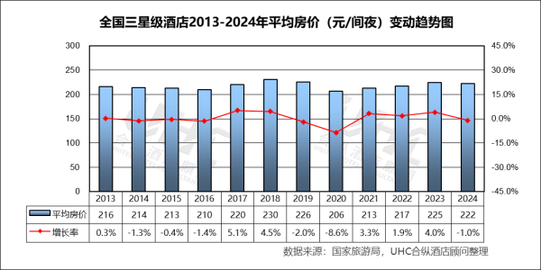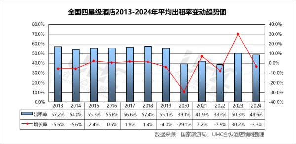 出租率方面,2013-2024年的平均出租率为54.2%,其中最高为2018年的62%,最低为2022年的38.8%。从变动趋势来看,2013–2019 年稳步上升出租率从 56.1% 提升至 62.0%(2018 为峰值),反映经济增长、商旅需求扩张和供需结构相对平衡;2020 年受疫情冲击,出租率仅 40.4%(–33.6%),为历史最低;2023 年出现“强效反弹”,2024 年小幅回落出租率下降至 57.3%(–1.9%),反映旅游需求恢复正常化后,供给端新增项目与老旧酒店的竞争加剧。