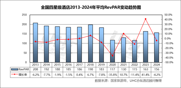 RevPAR方面,2013-2024年的平均RevPAR为168元,其中最高为2013年的208元,最低为2022年的115元。从变动趋势来看,2013–2019 年 RevPAR 基本维持在 180–200 元区间,体现相对稳定的经营效率;2020 年断崖式下滑至 约 117 元,行业盈利能力严重受损;2021–2023 年快速反弹,2023 年同比大幅增长,但主要源于低基数效应;2024 年回落至约 156 元,仍明显低于疫情前水平。