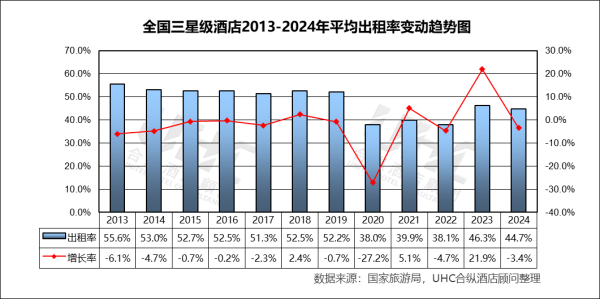 出租率方面,2013-2024年的平均出租率为48.1%,其中最高为2013年的55.6%,最低为2020年的38.0%。从变动趋势来看,2013–2019 年整体稳定在52%–56%区间,体现三星级酒店作为城市基础住宿的重要需求支撑;2020 年出租率骤降至 38.0%,同比降幅达 -27.2%,为全周期最低点,受冲击程度明显;2021–2022 年修复乏力反映商务出行与团队旅游恢复缓慢;2023 年出现明显反弹,出租率同比大幅增长 21.9%,显示出压抑需求集中释放;2024 年小幅回落至 44.7%,增长动能趋于平缓。