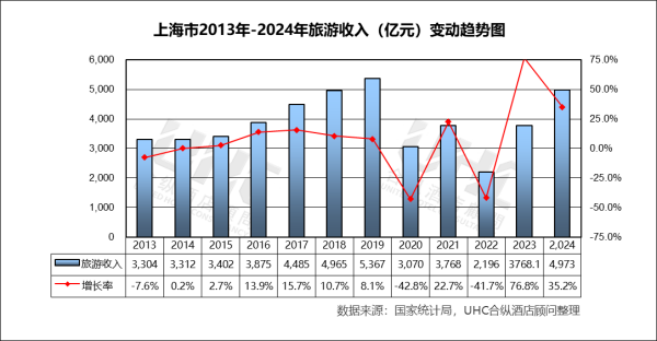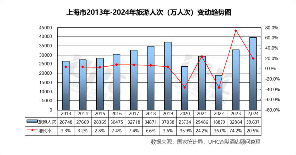 旅游人次方面,2013–2019 年上海接待规模稳步提升,由 2.67 亿人次 增至 3.73 亿人次,反映城市综合吸引力持续增强。2020 年旅游人次明显下滑(-35.9%),2022 年跌至低点。2023 年在出行需求集中释放的背景下,同比激增 74.2%,2024 年进一步增长至 3.96 亿人次(+20.5%),已超过 2019 年水平。