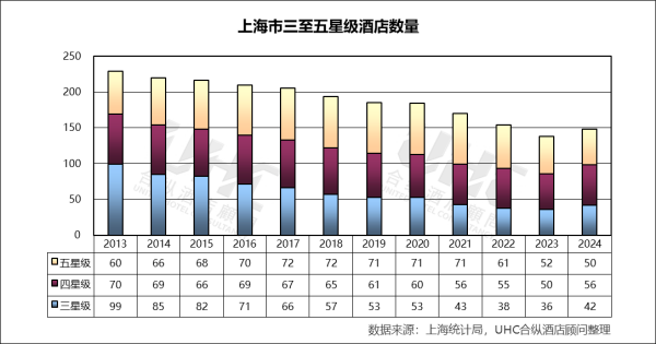 从2013年至2024年,上海市三至五星级酒店的总数呈现明显的震荡下行趋势。星级酒店总量从2013年的229家减少至2023年的138家,降幅接近40%。值得注意的是,2024年数据出现了小幅回升(从138家升至148家),这可能预示着在经历疫情后的市场出清后,行业进入了新一轮的品牌重塑与存量翻新周期。