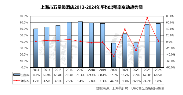 上海市四星级酒店2013-2024年的平均房价为492元,其中最高为2018年的554元,最低为2022年的408元。从变动态势来看,2013-2018年四星级酒店房价在这一阶段表现出较强的稳健性,由500元/间夜稳步推升至554元的历史峰值,这轨迹反映了随城市商务地位提升,资产溢价能力的持续释放;2020-2022年,ADR经历了约20%左右的阶梯式下调,至2022年触及408元的谷底;2023年(478元)与2024年(494元)的快速回升,显示出上海市场极强的价格修复弹性;尽管2024年均价距离2018年的最高点仍有约10.8%的空间,但已基本回归2013-2014年的历史基准水平。出租率方面,2013-2024年的平均出租率为59.8%,其中最高为2016-2017年的68.6%,最低为2020年的36.4%。从变动态势来看,2014-2017年是上海四星级市场的黄金期,OCC持续维持在67%-68%的高位,体现了极高的运营效率与供需均衡性;2020年出租率遭遇“腰斩”,骤降至约38%,2022年仍在同等低位徘徊,这极端暴露了高端酒店业务模式在外部冲击下的脆弱性,尤其是对商务、会展及国际客流的重度依赖;2023年出租率实现近乎翻倍的强劲反弹至约67%,直接引爆了当年RevPAR的惊人增长;2024年稳定在68.5%左右的高位,标志着市场需求已恢复至疫情前健康水平,复苏的第一阶段(补需求)基本完成。