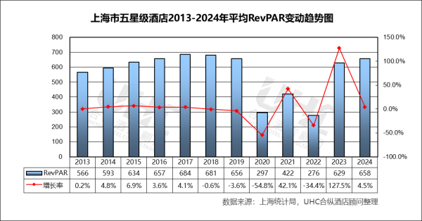 出租率方面,2013-2024年的平均出租率为61.0%,其中最高为2017年的71.3%,最低为2020年的37.8%。从变动态势来看,2013–2017年OCC稳步上行(60.1%→71.3%),体现商务与会展需求扩张对高星市场的持续支撑;2018–2019年小幅回落但仍维持高位,市场处于成熟均衡阶段。疫情冲击下,2020年出租率骤降至约37.8%,2022年进一步探底至约38.4%,凸显了以线下聚集和国际客流为核心的高端酒店商业模式在系统性风险下的极端脆弱性。2023年OCC强劲反弹至67.3%(同比+74.7%),2024年进一步至68.5%(同比+1.8%)。尽管尚未全面重回2017年峰值,但已恢复至接近疫情前常态水平,表明市场从“补偿性修复”转向“常态化运营”。