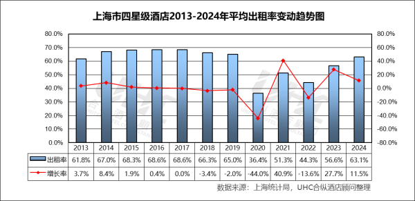 出租率方面,2013-2024年的平均出租率为59.8%,其中最高为2016-2017年的68.6%,最低为2020年的36.4%。从变动态势来看,2014-2017年是上海四星级市场的黄金期,OCC持续维持在67%-68%的高位,体现了极高的运营效率与供需均衡性;2020年出租率遭遇“腰斩”,骤降至约38%,2022年仍在同等低位徘徊,这极端暴露了高端酒店业务模式在外部冲击下的脆弱性,尤其是对商务、会展及国际客流的重度依赖;2023年出租率实现近乎翻倍的强劲反弹至约67%,直接引爆了当年RevPAR的惊人增长;2024年稳定在68.5%左右的高位,标志着市场需求已恢复至疫情前健康水平,复苏的第一阶段(补需求)基本完成。