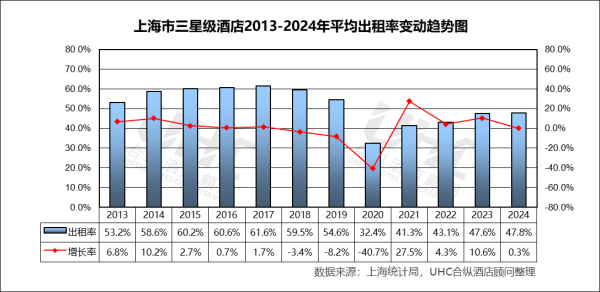 上海市三星级酒店2013-2024年的平均房价为342元,其中最高为2017年的371元,最低为2013年的314元。从变动态势来看,2013-2017年ADR从314元增长至371元,年均波动向上。这一阶段受益于上海城市商务活动的繁荣以及通胀带来的自然调价;2018-2022年受中高端品牌酒店下沉及市场竞争加剧影响,房价开始松动,2020年受突发卫生事件冲击ADR下跌8.8%,跌至321元,但在后续两年表现出极强的“保价”韧性; 2023-2024年出现爆发式反弹(+9.2%),房价拉升至354元,2024年继续微增至357元。出租率方面,2013-2024年的平均出租率为51.7%,其中最高为2017年的61.6%,最低为2020年的32.4%。从变动态势来看,2013-2015年出租率连续三年维持在60%以上,并在2017年达到61.6%的十年高位;2018-2022年开始出现需求分流,OCC跌破60%,2020年降至32.4%的冰点,尽管2021-2022年有所波动,但始终未能重回50%区间;2023-2024年OCC回升至47.6%,2024年小幅微升至47.8%。
