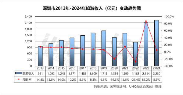 结合《旅游收入》与《过夜旅游人次》趋势图,2022年是市场的历史底部(收入1,162亿元,过夜游客4,896万人次)。2023年旅游收入同比激增87.2%,过夜人次增长44.6%。至2024年,过夜旅游人次已达8,298万,远超疫情前(2019年)的6,718万。这标志着深圳旅游业已完全摆脱疫情负效应,进入规模扩张的新阶段。2024年旅游收入增速(5.5%)虽较2023年的报复性反弹有所回落,但总量(2,230亿元)创下历史新高。这意味着深圳正通过高端商务聚集、深中通道开通以及“山海连城”等城市营销,实现了客流量与消费能级的双重增长。