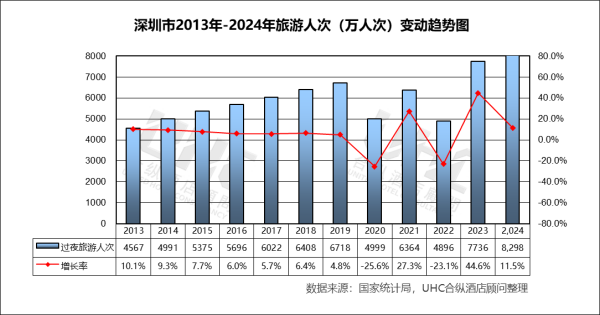 2024年,深圳在“高质量发展”的征程上取得了突破性进展,城市经济韧性与创新活力持续爆发。全年GDP将迈向3.6万亿元人民币的新高度,增长势头继续领跑国内重点城市。2024年,伴随深中通道的正式通车以及国际免签政策的落地,深圳旅游业迎来了爆发式的“黄金年”。全年接待国内外游客总数突破8000万人次,创下历史新高;旅游总收入跨越2200亿元人民币大关,同比增长超5%。依托科技赋能与体验升级,深圳酒店业不仅在出租率上实现了全面超越,更在服务品质与国际声誉上确立了全球标杆。