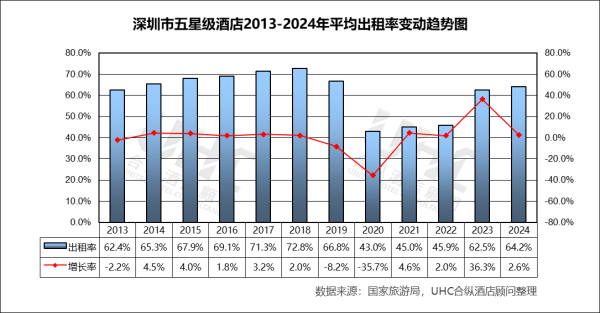 深圳市四星级酒店2013-2024年的平均房价为403元,其中最高为2018年的428元,最低为2020年的377元。从变动趋势来看,2013-2018年房价长期维持在400-430元区间,2018年达到峰值428元,显示出当时深圳商务市场的强劲支撑力;2019-2023年受宏观环境影响,2020年房价下探至377元的低点,随后在2023年强劲反弹至407元,这反映了行业在需求复苏初期的“价格优先”策略; 2024年均价回落至383元,同比下降5.9%,这预示着在市场竞争加剧及消费趋于理性的背景下,四星级酒店正经历结构性价格回归,依靠单纯提价获取增长的红利消退。出租率方面,2013-2024年的平均出租率为59.5%,其中最高为2017年的71.4%,最低为2020年的43.8%。从变动趋势来看,2017年出租率达到71.4%的最优水平,与同年RevPAR的高峰相呼应,标志着深圳酒店市场的黄金成长期;2020-2023年出租率在2020年腰斩至43.8%;尽管2023年旅游业全面复苏,但出租率仅为49.9%,未过半数,反映出中端及高端酒店存量过剩与替代产品(如电竞酒店、精品民宿)分流带来的压力;2024年出租率回升至54.2%,虽同比增长8.6%,但较之2017年的巅峰(71.4%)仍有巨大缺口,这说明市场需求虽在回暖,但增量需求难以完全消化庞大的客房供应,行业进入“存量博弈”时代。