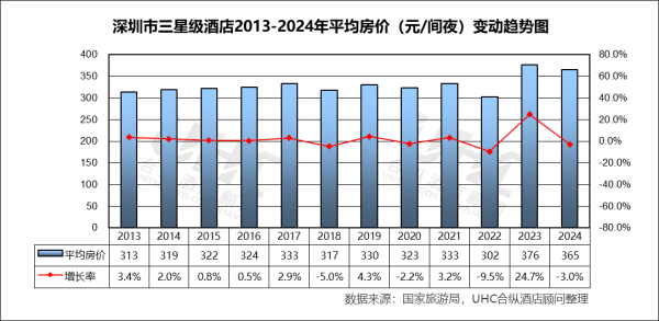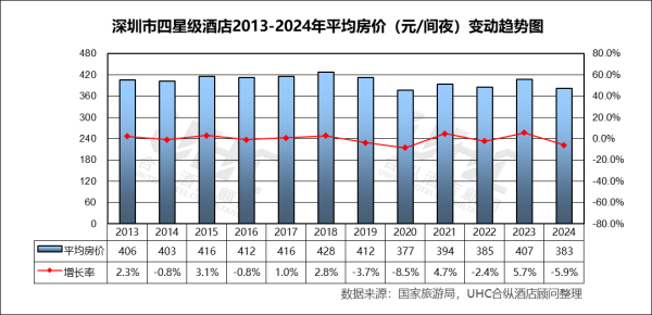 深圳市三星级酒店2013-2024年的平均房价为330元,其中最高为2023年的376元,最低为2022年的302元。从变动情况来看,2013-2021年三星级酒店房价展现出极强的抗风险韧性,长期徘徊在310-335元区间;2020年其房价(323元)也并未出现断崖式下跌,体现了三星级酒店作为刚需商务市场的价格底部支撑;2023年房价攀升至376元的历史最高点,同比增速高达24.7%,这一现象主要受后疫情初期补偿性旅游、大型会展活动复苏以及行业通胀压力共同推动,标志着市场进入了高溢价修复阶段;2024年房价微调至365元(-3.0%),但仍显著高于2013-2021年的历史平均水平,这表明深圳市三星级酒店的价格体系已完成整体台阶式的上移。