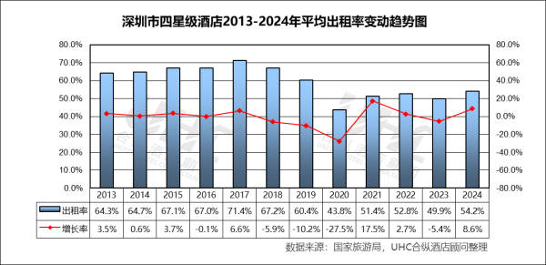 出租率方面,2013-2024年的平均出租率为59.5%,其中最高为2017年的71.4%,最低为2020年的43.8%。从变动趋势来看,2017年出租率达到71.4%的最优水平,与同年RevPAR的高峰相呼应,标志着深圳酒店市场的黄金成长期;2020-2023年出租率在2020年腰斩至43.8%;尽管2023年旅游业全面复苏,但出租率仅为49.9%,未过半数,反映出中端及高端酒店存量过剩与替代产品(如电竞酒店、精品民宿)分流带来的压力;2024年出租率回升至54.2%,虽同比增长8.6%,但较之2017年的巅峰(71.4%)仍有巨大缺口,这说明市场需求虽在回暖,但增量需求难以完全消化庞大的客房供应,行业进入“存量博弈”时代。