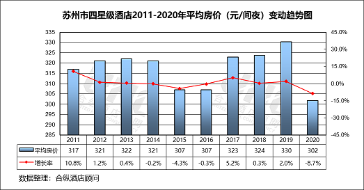 出租率方面,2011-2020年的平均出租率为50.8%,其中最高为2017年的59.6%,最低为2020年的32.3%。从变动分析来看,2014-2017年出租率逐年上升,2018-2019年逐渐回落,2020年受疫情影响,苏州四星级出租率同比大幅下滑35.9%。
