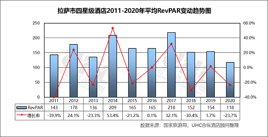 RevPAR方面,2011-2020年的平均RevPAR为268元,其中最高为2015年的526元,最低为2020年的26元。从变动分析来看,2013-2015年RevPAR显著上升趋势,2016年下降幅度大,2017-2019年逐渐有所回升。2020年受平均房价和出租率均大幅下跌的影响,拉萨市五星级酒店RevPAR骤降至历史最低点。