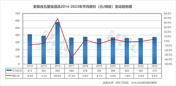 安徽省五星级酒店2014-2023年的平均房价为375元,其中最高为2014年的413元,最低为2019年的355元。从变动态势来看,除2014年安徽五星级酒店平均房价达到400元/间夜以上,其他年份安徽五星级酒店平均房价基本保持在355-400元/间夜的区间。
