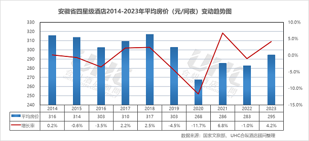 出租率方面,2014-2023年的平均出租率为53.9%,其中最高为2018年的65.2%,最低为2020年的43.3%。从变动态势来看,2014-2019年安徽五星级出租率总体保持增长态势,2017-2019年均达到60%以上。2020年受疫情影响,平均出租率同比断崖式下降超30%。2021年短暂上升后2022年又出现下跌,2023年上升基本恢复至疫前2019年水平。