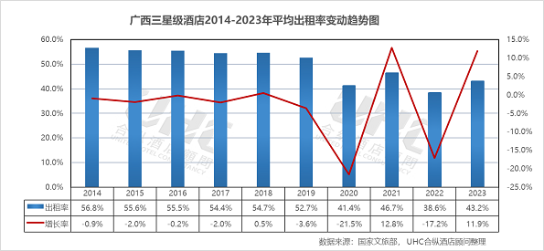 出租率方面,2014-2023年的平均出租率为52.8%,其中最高为2018年的63.7%,最低为2020年的36.0%。从变动态势来看,2014-2019年广西五星级出租率整体呈现增长态势,平均出租率均在55%以上。2020年受疫情影响,平均出租率同比断崖式下降超35%。2021年-2023年稳定回升,2023年恢复至疫前2019年的九成水平。