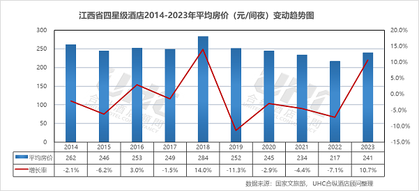 出租率方面,2014-2023年的平均出租率为49.2%,其中最高为2014年的56.4%,最低为2020年的39.4%。从变动态势来看,2014-2019年,江西省三星级酒店出租率总体稳定,基本保持在51%-57%区间。2020年受疫情影响三星级出租率下跌幅度超20%。2021年短暂回升后2022年再度下跌。2023年小幅上升,基本恢复至疫前2019年水平。