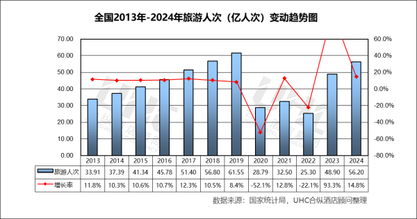 2013–2019年从 33.9 亿人次增长到 65.4 亿人次,年均增速稳定在 10% 左右,表明全民旅游时代的形成。2020 年下降至 25.5 亿人次,跌幅高达 -52.1%。2021 年增长 12.8%,但仍处低位。2022 年因疫情反复再次下降至 25.3 亿人次(-22.1%)。2023 年出现爆发式增长(+93.3%),是旅游人次重返常态化的关键节点。2024 年达 56.2 亿人次,接近 2019 年高峰值。