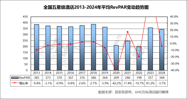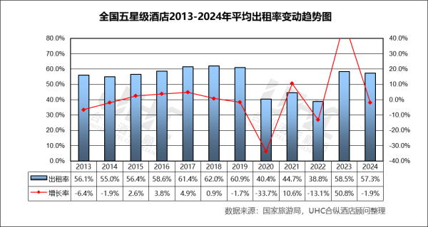 出租率方面,2013-2024年的平均出租率为54.2%,其中最高为2018年的62%,最低为2022年的38.8%。从变动趋势来看,2013–2019 年稳步上升出租率从 56.1% 提升至 62.0%(2018 为峰值),反映经济增长、商旅需求扩张和供需结构相对平衡;2020 年受疫情冲击,出租率仅 40.4%(–33.6%),为历史最低;2023 年出现“强效反弹”,2024 年小幅回落出租率下降至 57.3%(–1.9%),反映旅游需求恢复正常化后,供给端新增项目与老旧酒店的竞争加剧。