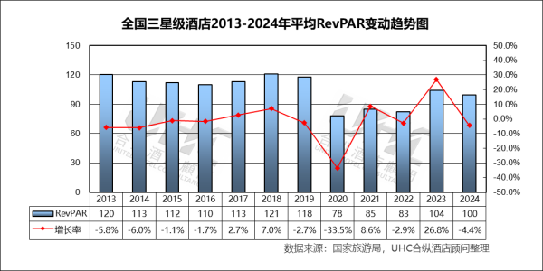 RevPAR方面,2013-2024年的平均RevPAR为105元,其中最高为2018年的121元,最低为2020年的78元。从变动态势来看,2013–2019年行业整体表现稳健,增长率波动幅度较小(-6.0%至7.0%),说明市场处于成熟期,供需相对平衡;2020年RevPAR骤降至78元,同比暴跌33.5%,直接体现新冠疫情对酒店业的毁灭性冲击;2021–2022年虽略有回升,但仍显著低于疫情前水平,反映行业复苏缓慢;2023年RevPAR大幅反弹至104元(+26.8%),受益于疫情管控放开后的报复性出行需求;2024年小幅回落至100元(-4.4%),可能反映需求回归理性、市场竞争加剧或成本上升压力。
