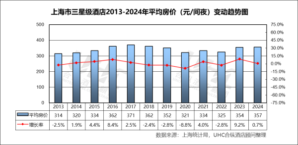 从2013年至2024年,上海市三至五星级酒店的总数呈现明显的震荡下行趋势。星级酒店总量从2013年的229家减少至2023年的138家,降幅接近40%。值得注意的是,2024年数据出现了小幅回升(从138家升至148家),这可能预示着在经历疫情后的市场出清后,行业进入了新一轮的品牌重塑与存量翻新周期。