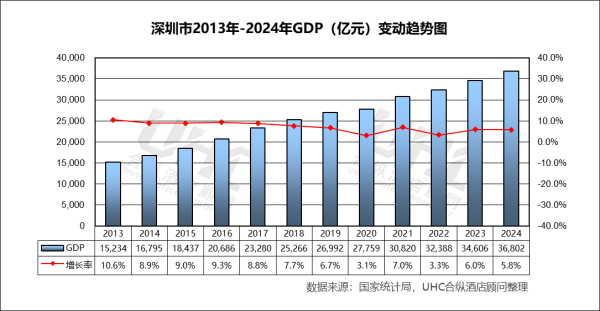深圳经济展现出显著的“阶梯式扩张”特征,从2013年的1.52万亿元增长至2024年的3.68万亿元,11年间总量翻了2.4倍,反映了深圳作为科技创新之都的持续增长动力。虽然受外部环境影响,2020年(3.1%)和2022年(3.3%)增速放缓,但2021年及2023-2024年的反弹(分别为7.0%、6.0%和5.8%)表明,深圳通过发展新质生产力有效抵御了宏观风险,为旅游及酒店业的繁荣提供了坚实的经济底座。