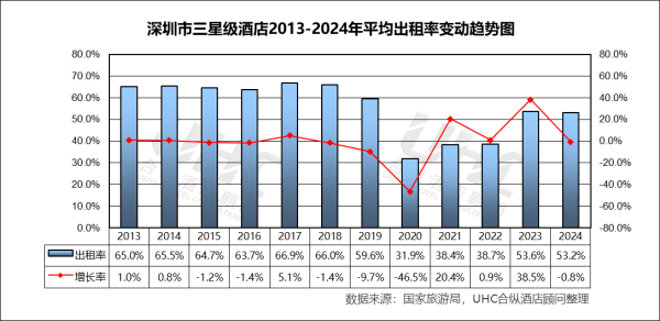 出租率方面,2013-2024年的平均出租率为59.5%,其中最高为2017年的71.4%,最低为2020年的43.8%。从变动趋势来看,2017年出租率达到71.4%的最优水平,与同年RevPAR的高峰相呼应,标志着深圳酒店市场的黄金成长期;2020-2023年出租率在2020年腰斩至43.8%;尽管2023年旅游业全面复苏,但出租率仅为49.9%,未过半数,反映出中端及高端酒店存量过剩与替代产品(如电竞酒店、精品民宿)分流带来的压力;2024年出租率回升至54.2%,虽同比增长8.6%,但较之2017年的巅峰(71.4%)仍有巨大缺口,这说明市场需求虽在回暖,但增量需求难以完全消化庞大的客房供应,行业进入“存量博弈”时代。